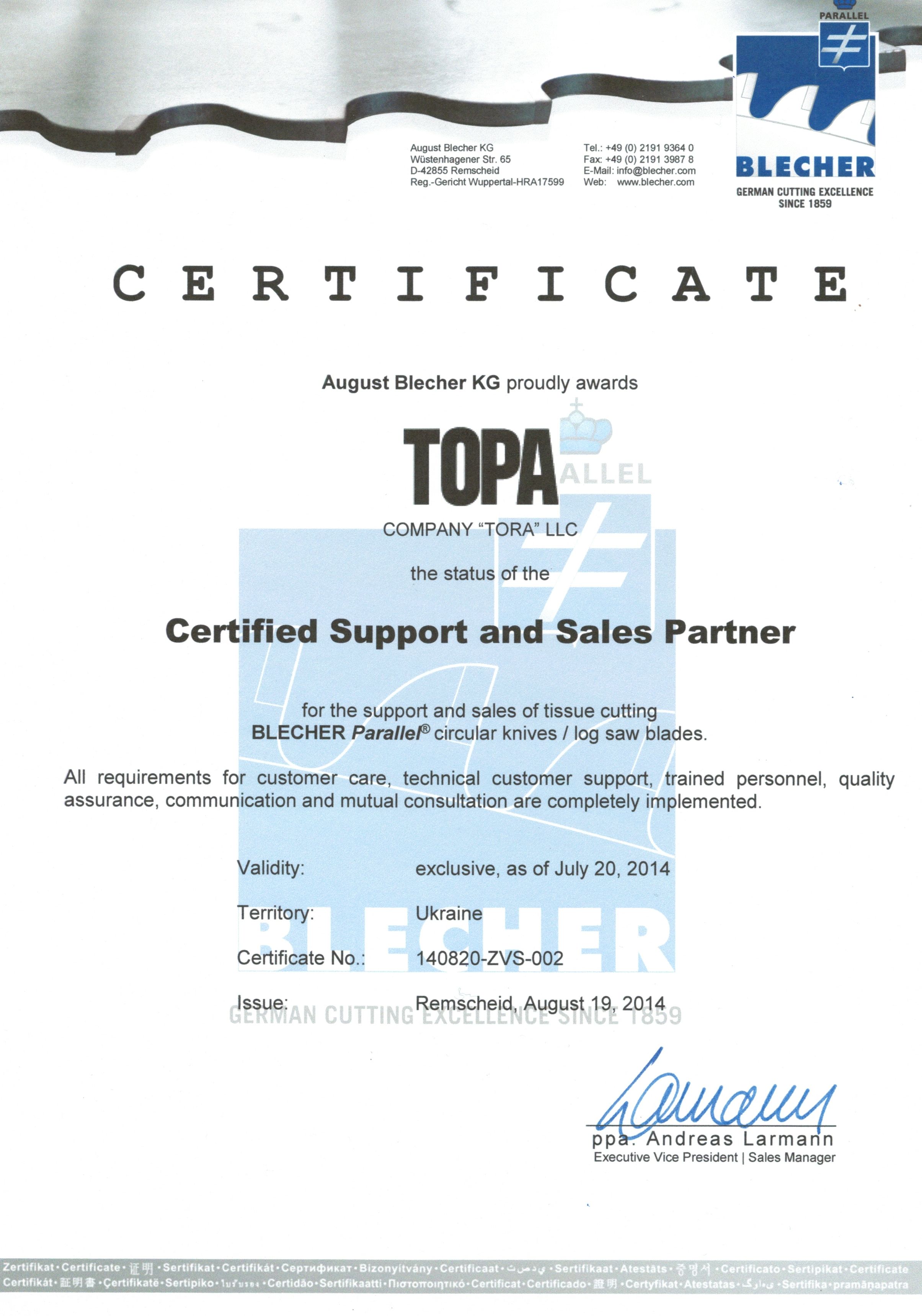 ООО "КОМПАНИЯ "ТОРА" является официальным и эксклюзивным представителем компании August Blecher AG в Украине.