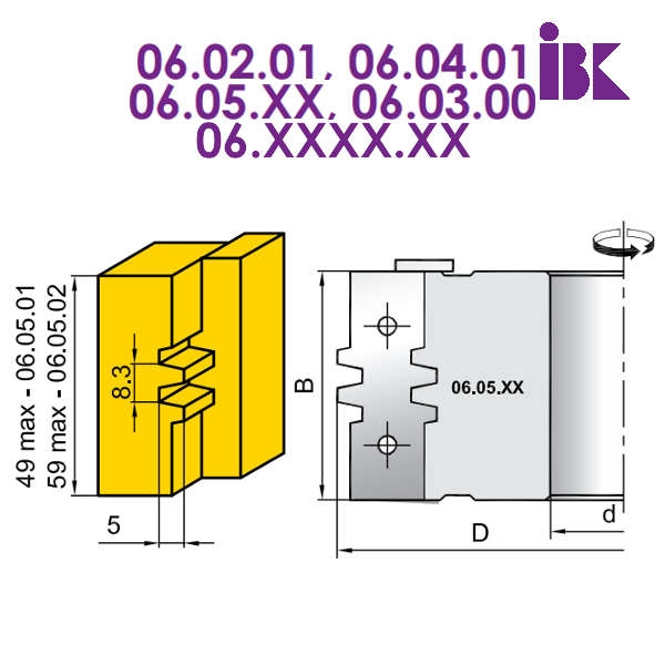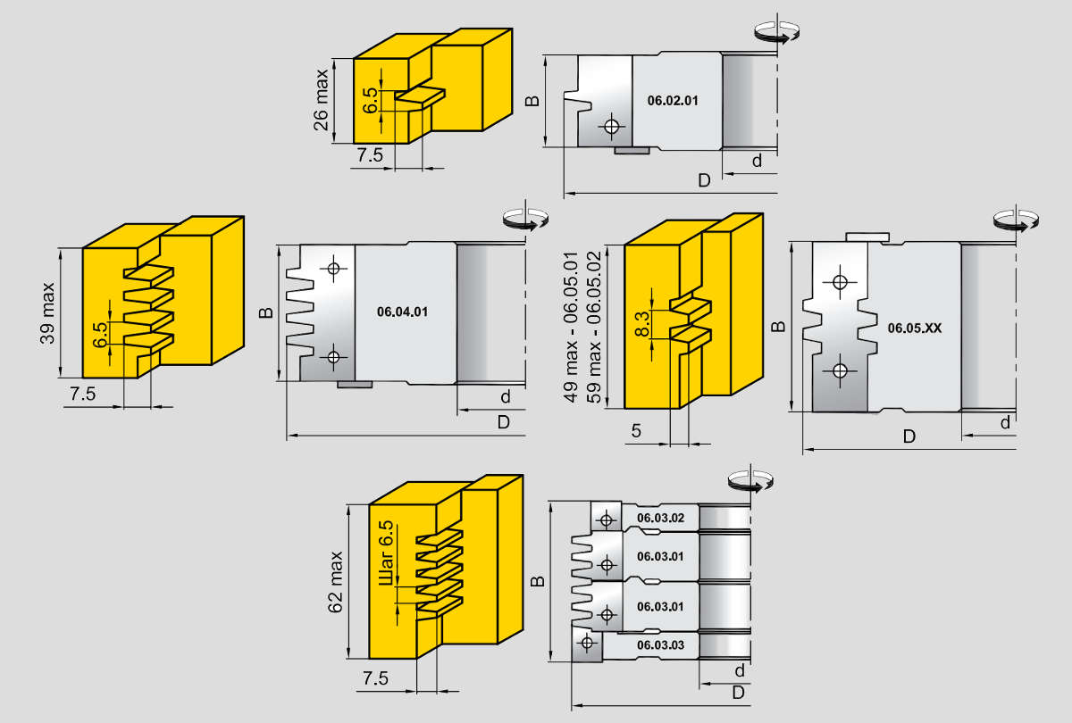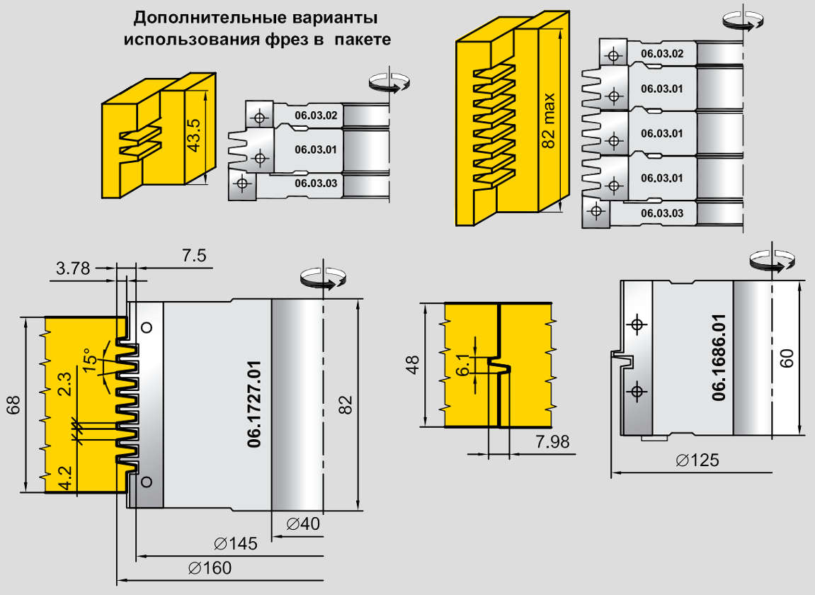 Примечание: 1. Конструкция фрез 06.03.ХХ позволяет набирать необходимый пакет фрез по ширине сращивания.