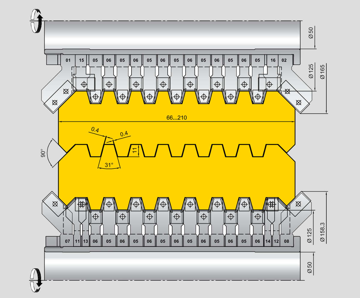 Ширина бруса настраивается дискретно (с шагом 24мм) установкой/изъятием пар фрез .05-.06, и плавно - раздвижкой пар фрез .11/12 - .13/14.