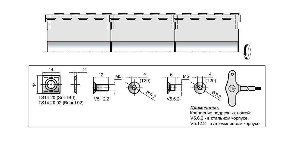 Фрезы насадные строгальные с квадратными твердосплавными ножами 14х14х2 мм, расположеными в ряд. Применяются для плоского строгания и калибровки заготовки из натуральной древесины мягких или твердых пород на 4-х сторонних продольно-фрезерных станках. Разнесенное расположение ножей снижает нагрузку на шпиндель и позволяет обрабатывать заготовки с большей скоростью подачи и глубиной съема.