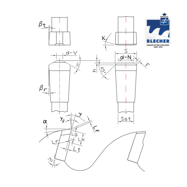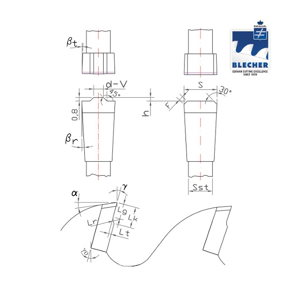 Специальная архитектура подразумевает наличие двух типов зуба: режущего и зачистного. Первый на несколько миллиметров выше второго, но обладает меньшей площадью рабочей поверхности. Он снимает только центральную часть места реза. Идущий следом зачистной зуб убирает остатки материала из зоны пропила. Таким образом стружка делится на три равные части, снимая нагрузку с пилы и предотвращая скорое ее засорение. Помимо этого зубья могут быть оснащены стружколомом — специальной канавкой на верхней поверхности, которая измельчает стружку после ее отделения. Также, дисковые пилы Blecher обладают достаточно большим шагом зуба, что значительно снимает напряжение с межзубной пазухи, продлевая не только эффективность, но и срок работы диска.