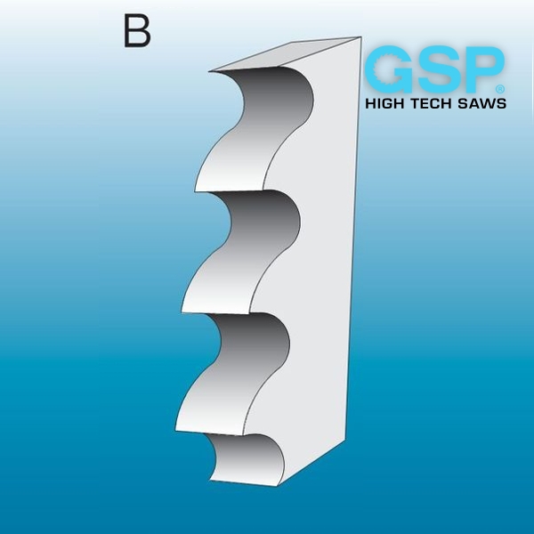 Дисковые пазовые пилы GSP с зубом среднего размера используются для формирования пазов в стальных профилей и трубах с тонкими стенками (3-4мм). Поставляются с зубом формы B — стандартным зубом. Характерной особенностью такой конфигурации является несколько увеличеная межзубная пазуха. Поэтому, в отличие от пазовых пил с формой зуба А, пильные диски с формой B, способны обрабатывать заготовки с большей толщиной стенки, без риска забивания зубов стружкой.
