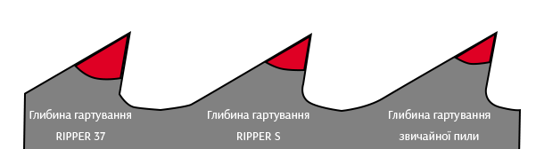 Ripper 37 для небольших деревообрабатывающих предприятий. Главной чертой данной линейки является меньшая глубина закалки зуба. Закаленная область режущей части хоть и тверже, обладает меньшей пластичностью. Поэтому, разводка таких полотен вручную, или с использованием устаревшего оборудования, увеличивает риск выламывания зуба. Пилы для пилорам Ripper S