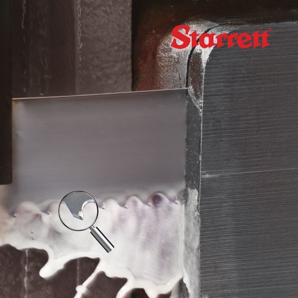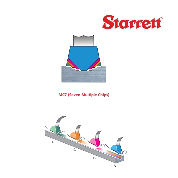 Помимо этого, главным достоинством полотна является передовая система формирования стружки – Multiple Chip 7. Пила имеет форму зуба прямой трапеция. Прямой зуб ниже всех остальных – он окончательно формирует зону реза. Трапециевидный зуб имеет три типа форм, различные по высоте и по длине верхней грани. Зубья сформированы так, что в процессе резки металла, пила делит стружку на 7 частей. Такая особенность максимально распределяет нагрузку по режущей кромке, предохраняет инструмент от преждевременных разрывов и разрушения напаек. Помимо этого, ленточные пилы Advanztm MC7 обеспечивают максимально точный, качественный и деликатный рез, поэтому пригодны для обработки ценных металлов.