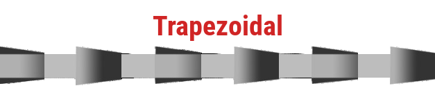 Trapezoidal. На зуб ленточной пилы крепится напайка, трапециевидной формы. За счет того, что рабочая поверхность пластины шире, чем корпус инструмента, разведение зубьев не требуется. Напайка принимает непосредственное участие в работе, в то время как корпус ленточного полотна совсем не контактирует с материалом.