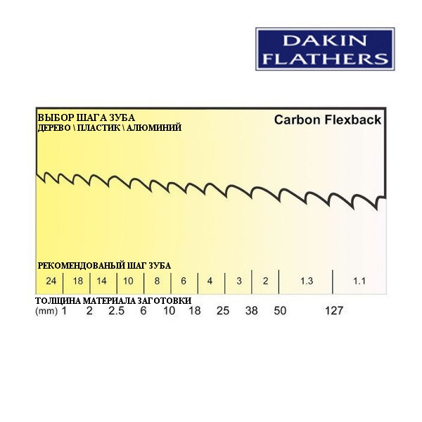 Благодаря современному методу индукционной закалки Flexback удается достигнуть оптимальных уровней твердости полотна и режущей кромки. Так, основа полотна имеет не высокую плотность 32-37 HRС сохраняя эластичность, в то время как сами зубья имеют максимально допустимый уровень твердость 64-67 HRС и износостойкости. Это не только существенным образом повышает ресурс ленточного полотна, но и дает возможность выполнять точные прямолинейные и криволинейные резы, поглощая вибрацию. Еще одним преимуществом углеродистых ленточных пил Dakin-Flathers является наличие мелких зубьев с шагом 18, 24 и 32 зуба на 1 дюйм, позволяющих резать с высоким качеством пластиковые и ПВХ тонкостенные листовые и профильные материалы даже с толщиной стенки до 1 мм.