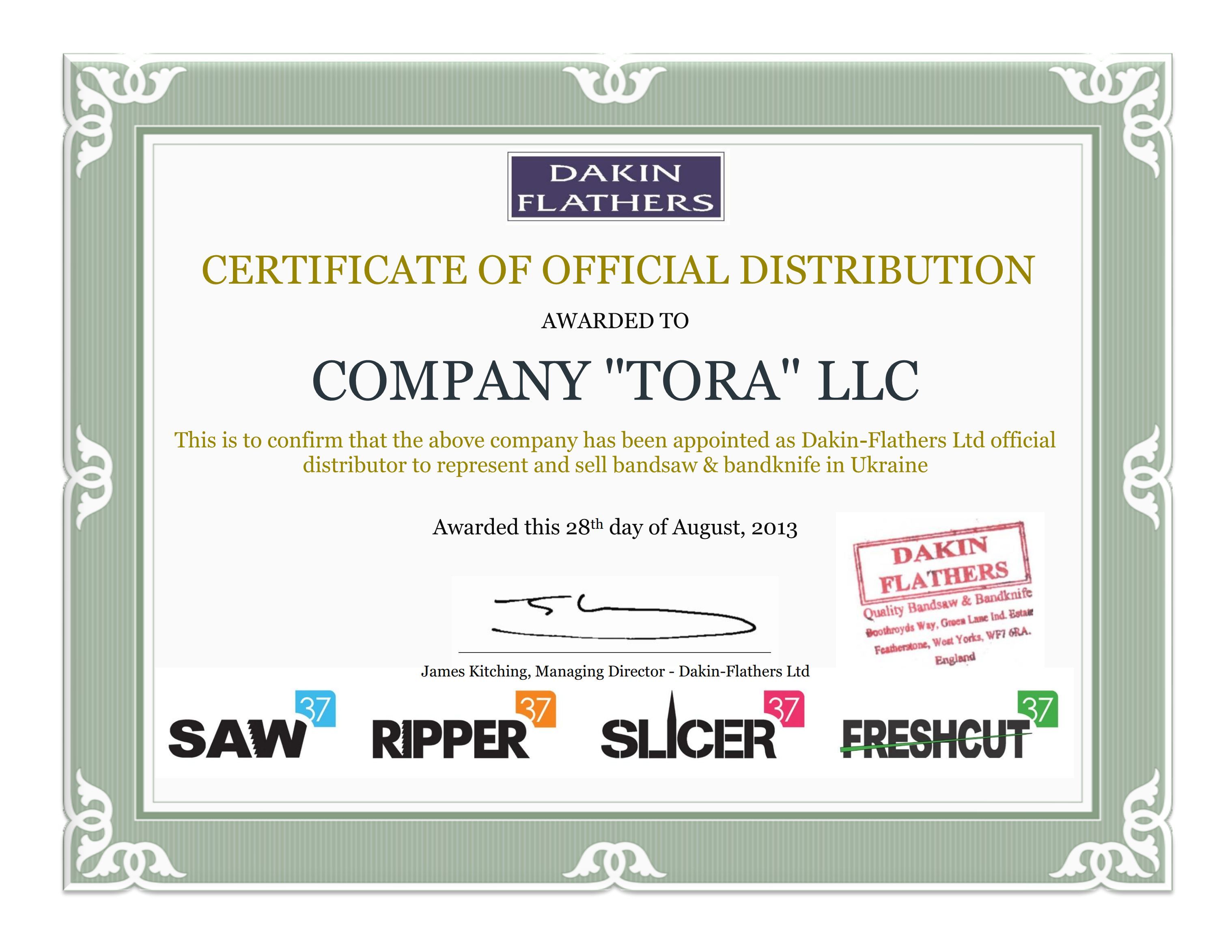 Dakin–Flathers Великобритания, является одним из кpyпнeйших производителей ленточных пил и ленточных ножей в Европе. Компания обладает более чем 115-летним опытом. Это современное производство с высокой степенью специализации и производственной мощностью более пятнадцати миллионов метров ленточных пил и ленточных ножeй в год. Высокотехнологичное CNC оборудования, формирование профиля зуба, посредством алмазного шлифования, запатентованная двух компонентная технология создания идеальной разводки зубьев и проверки качества, контролируемые компьютером на каждой стадии производственного процесса, позволяют получать ленточные полотна высокого качества, постоянно превышающие заданные показатели производительности.